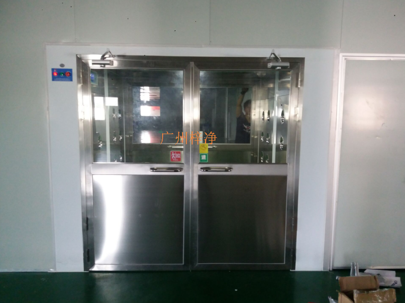 五、手動門風淋室與自動門風淋室是一種高端場所必備的設備,風淋室又叫風淋設備,是人員進入潔凈室無塵車間所必備的凈化設備,通用性強,可與所有的潔凈室和潔凈廠房配套使用,工作人員進入車間時,必須通過風淋室,用強勁潔凈的空氣,由可旋轉噴嘴從各個方向噴射至人身上,有效而迅速清除去附著在衣服上的灰塵、頭發、發屑等雜物,風淋室可以減少人進出潔凈室所帶來的污染問題。