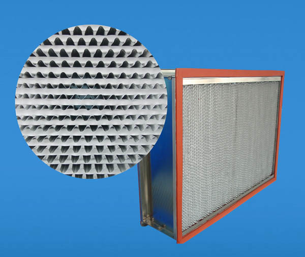 耐高溫高效過(guò)濾器使用隔板式設(shè)計(jì),波紋形隔板可以精確地保持褶層間距,有小阻力下,有大限度地用濾料。過(guò)濾器濾材兩面180褶翻折形成鍥形褶層,濾料折彎時(shí)有兩道壓痕,使其在隔板的尾端開成鍥形盒式褶層,鍥形盒式褶層可以防止濾料破損。