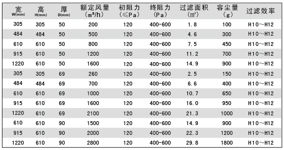 無隔板亞高效過濾器過濾效率:H10,H11,H12(EN1822)。