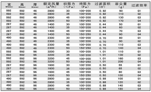 初效過濾器規(guī)格尺寸及型號參數(shù):