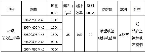 G2級初效過濾器主要適用于空調與通風系統預過濾潔凈室回風過濾局部高效過濾裝置的預過濾用于過濾 5um 及以上粒徑的塵埃粒子。