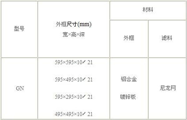 GN尼龍網初效過濾器規格尺寸及技術參數: