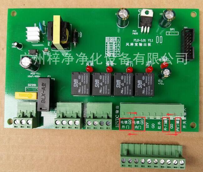 第二種方法:拆開風淋室控制器那塊檢修板找到風淋室副板如下圖,把風淋室的前后門鎖及前后門磁線互換一下就可以了。