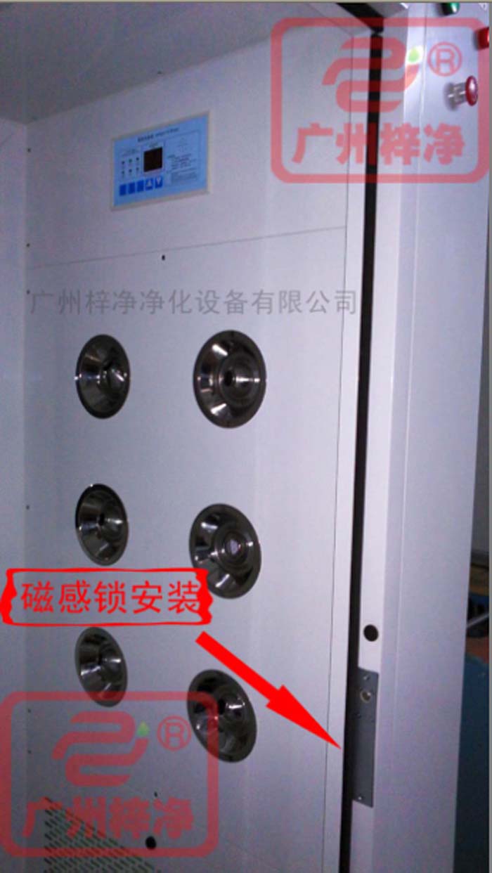 風淋室磁感應鎖是風淋室配件之一,每臺風淋室都離不開磁感應鎖,風淋室磁感應鎖裝置常安裝于需要兩門、三門或多門風淋室聯(lián)鎖的自動控制的房間。風淋室結構主要有電子控制盒,電磁鎖及感應開關三部分組成。風淋室電磁鎖及感應開關分別按裝于門及門框間,其輸入電線插上控制盒相應的輸出電線的插頭就可連通,電子控制盒可按放在頂層,接通電源后即可工作。