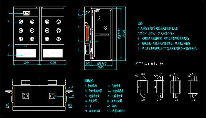7、配2臺風淋室專用風機,總功率:1.1KW/臺,確保吹淋效果,風速≥22-25m/s雙側吹淋,配24個不銹鋼噴嘴。
