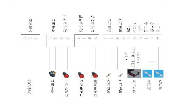 a、急停按鍵:任何時候按下急停按鍵,液晶屏內急停圖標閃爍,并自動斷開除照明外的所有輸出,再次按下時,系統恢復到初始狀態。此按鍵主要用于內外門不能解鎖、風淋不能自動關閉及其它需維護時