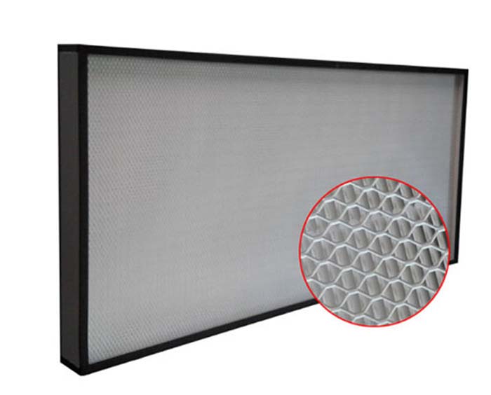 高效過(guò)濾器主要用于捕集0.3um及以下的顆粒灰塵及各種懸浮物,過(guò)濾效率為99.99%@0.3um。采用超細(xì)玻璃纖維紙作濾料,膠版紙、鋁膜等材料作分割板,與鋁合金膠合而成。