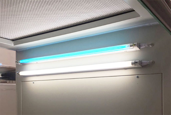 在超凈工作臺(tái)上亦可吊裝紫外線(xiàn)燈,但應(yīng)裝在照明燈罩之外,并錯(cuò)開(kāi)照明燈的排列,這樣在工作時(shí)不妨礙照明。切忌將紫外線(xiàn)燈裝入照明燈罩(玻璃板)里面,因?yàn)樽贤饩€(xiàn)不能穿透玻璃,它的燈管是石英玻璃,而不是硅酸鹽玻璃的。